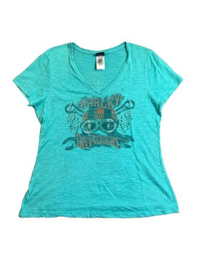 Harley Davidson Shirt Womens Large Teal Green Boots on Fire Wisconsin Motorcycle