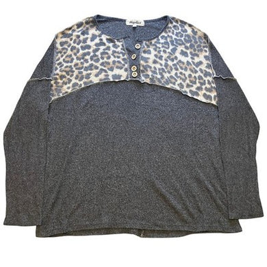 Haptics Shirt Womens 1XL Leopard Print Henley Long Sleeve Gray Knit Pullover