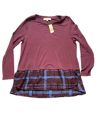 LOFT Sweater Womens Large Petite Burgundy Flounce Plaid Tunic Rayon Nylon NWT