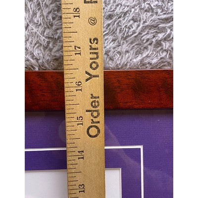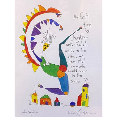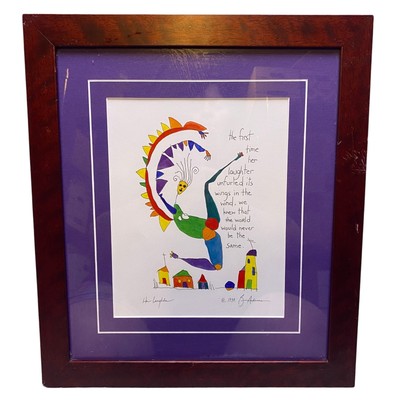 Enliven your living space with this captivating framed art print! A burst of color and whimsy, this piece features an abstract figure dancing amidst charming houses, accompanied by the poetic inscription, "The first time her laughter unfurled its wings in the wind, we knew that the world would never be the same." The vibrant hues and playful design create a sense of joy and wonder, making it a delightful addition to any room. The artwork is signed and dated 1993, adding a touch of vintage charm and authenticity. The piece is framed with a purple matte and a dark wood frame. Perfect for a children's room, a creative studio, or any space where you want to inspire imagination and positivity.