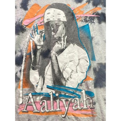 Keywords: Aaliyah t-shirt, tie dye shirt, graphic tee, mens medium, hip hop fashion, 90s clothing, R&B, music shirt, vintage style, retro tee, band tee, casual wear, streetwear, unisex, grey t-shirt