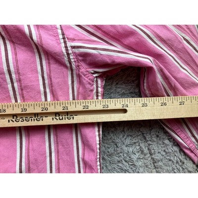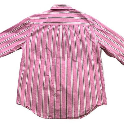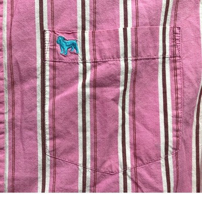 Make a statement in this vibrant, pink striped Aeropostale button-down shirt. Radiating preppy sophistication, this classic-fit shirt features long sleeves, offering versatility for rolled-up casual looks or polished, buttoned-up style. Notice the crisp stripes in shades of white and brown, lending visual depth and timeless appeal. Adding a playful touch, a turquoise embroidered logo embellishes the chest pocket. The comfortable construction ensures ease of movement, while the tailored silhouette provides a sharp, modern fit. Perfect for a weekend brunch, a casual Friday at the office, or even a laid-back date night, this shirt effortlessly elevates any ensemble.