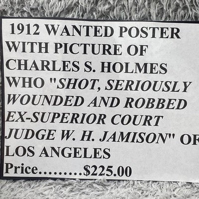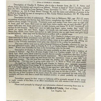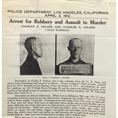 Keywords: 1912, Los Angeles, Police Department, Arrest Poster, Wanted Poster, Charles Holmes, Robbery, Assault, Murder, Historical Memorabilia, Law Enforcement, Crime History, Collectibles, Vintage Poster