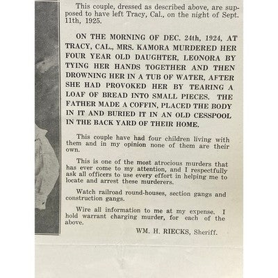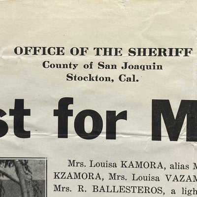 Keywords: 1925, Sheriff's Office, Arrest Circular, Murder, Stockton CA, Vintage, Crime Memorabilia, California History, Law Enforcement, Historical Document, Ephemera, True Crime Collectible, Antique, Poster