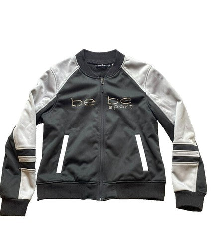 Bebe Jacket Womens Large Black Gray Sport Full Zip Bomber Fleece Activewear Lady