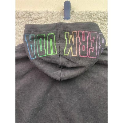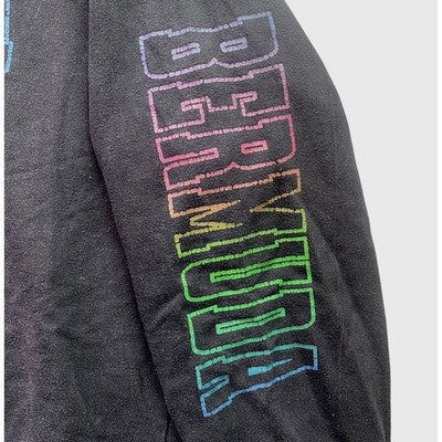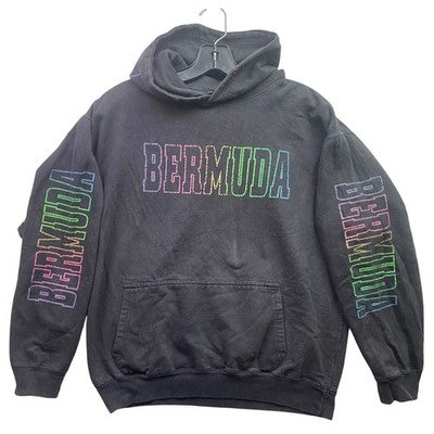 Embrace island vibes with this striking Bermuda hoodie. Boasting bold "BERMUDA" lettering across the chest, down both sleeves, and across the back of the hood, this pullover hoodie makes a statement wherever you go. The multicolor print adds a playful pop of color to the classic black, making it easy to pair with your favorite jeans or joggers. A comfortable and casual staple with a kangaroo pocket for added convenience, this hoodie is perfect for relaxed weekends, casual outings with friends, or adding a touch of vacation style to your everyday look.