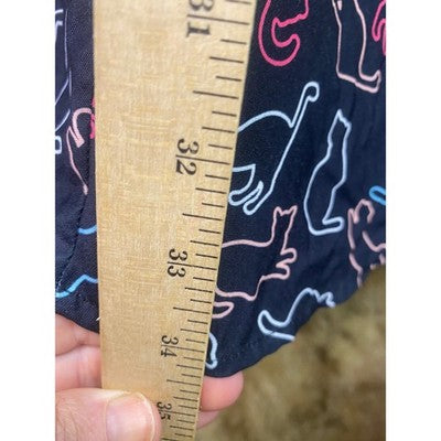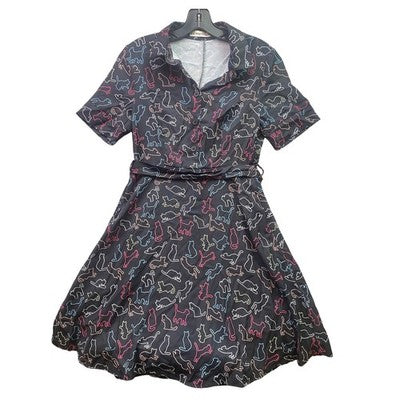 Step into a world of whimsical charm with this adorable black dress, a true statement piece that merges comfort with playful elegance. Button details at the top add a touch of sophistication, while the short sleeves create a casual, breezy feel. It includes a matching fabric belt to cinch the waist, creating a flattering silhouette. The all-over cat print, featuring colorful outlines, brings a unique and eye-catching element to the design, perfect for expressing your individuality. This dress is ideal for daytime outings, casual gatherings, or even a fun night out with friends.