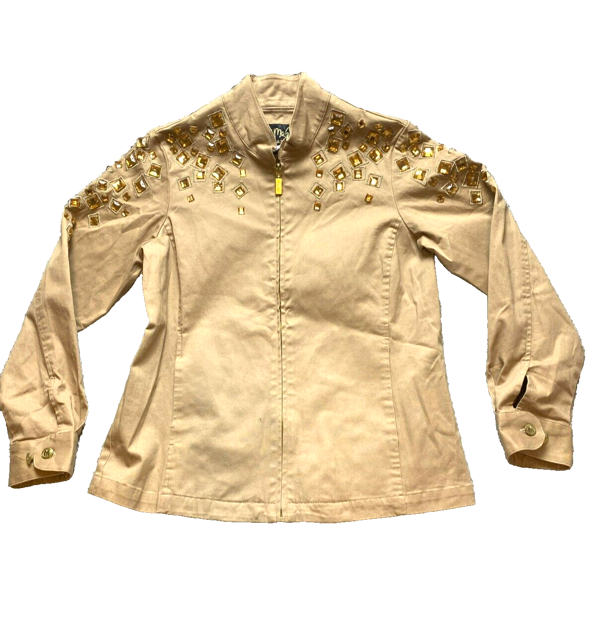 Bob Mackie Jacket Womens Extra Small Taupe Wearable Art Zip Up Embellished Gems