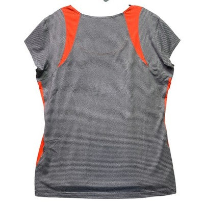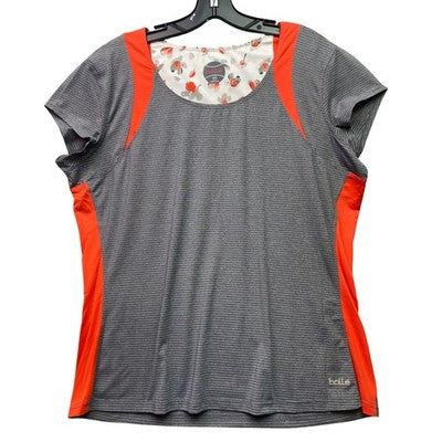 Keywords: Bolle shirt, womens athletic top, activewear, performance tee, striped shirt, orange accent, plus size activewear, workout shirt, casual top, athleisure wear, sporty, comfortable, breathable