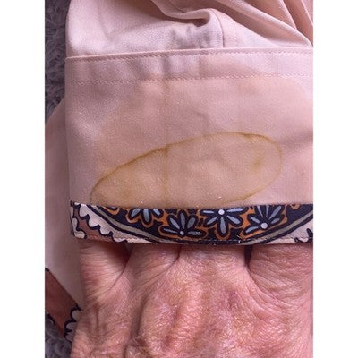 Elevate your wardrobe with this Brooks Brothers button-down shirt, a testament to timeless style and sophisticated detail. The peach hue offers a soft, flattering palette, while the fitted silhouette ensures a sleek and modern look. Notice the unique paisley trim along the cuffs and hem, adding a touch of bohemian flair to this classic piece. The buttoned cuffs and front placket provide a polished finish, making it versatile enough for both professional and casual settings. Imagine wearing this shirt to a business casual meeting, a weekend brunch with friends, or a relaxed evening out.