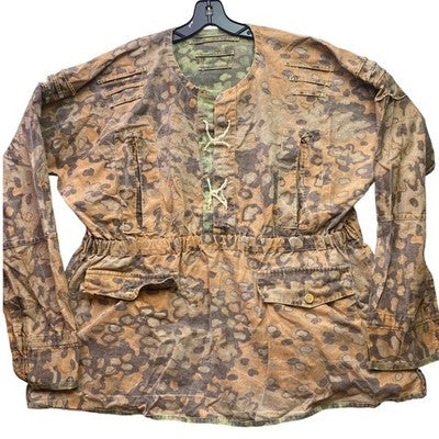 Discover a unique statement piece with this vintage camouflage jacket. Its distinctive lace-up front and drawstring waist create a flattering silhouette, while the multiple utility pockets offer practical style. The intricate camouflage pattern in earthy tones adds a touch of rugged charm, perfect for an edgy weekend look or a standout addition to your casual wardrobe. Elevate your everyday outfits with this eye-catching jacket for outdoor adventures or city explorations.