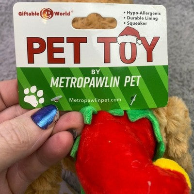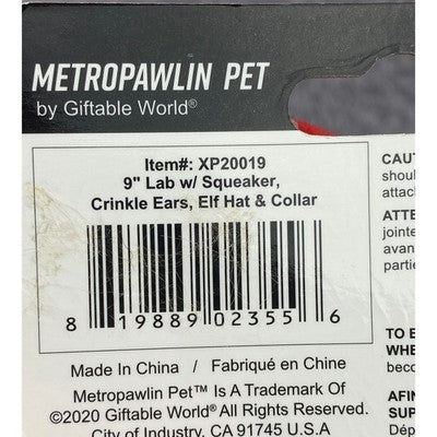 Unleash holiday cheer with this adorable Metro Pawlin Pet toy, a 9-inch plush Lab ready to delight your furry friend. This charming toy features crinkle ears that provide satisfying sensory feedback and a playful squeaker that sparks excitement during playtime. Adorned with a festive elf hat and collar, it's designed for maximum fun and durability. Perfect for indoor play sessions or as a special holiday surprise for your beloved canine companion.