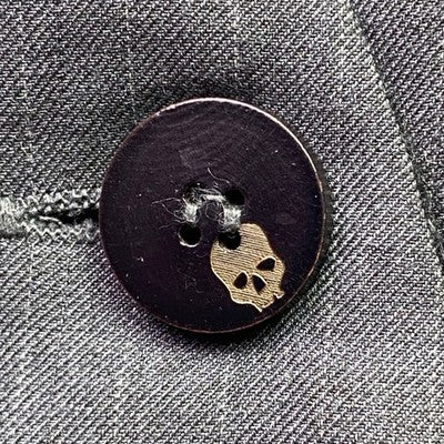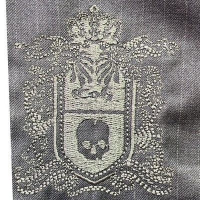 Elevate your wardrobe with this distinguished Coleridge vest, a statement piece designed for the modern gentleman. The rich grey fabric is subtly enhanced with a classic pinstripe pattern, creating a refined texture that catches the eye. Adorning the chest is an intricately embroidered crest, featuring a regal crown and a bold skull motif, adding a touch of edgy sophistication. The front is fastened with unique dark buttons, each detailed with a miniature skull emblem, showcasing meticulous attention to detail. The interior is lined with a luxurious patterned fabric, offering a hidden touch of opulence. Perfect for adding a sharp finish to formal attire or injecting personality into a smart casual ensemble, this vest is ideal for a stylish evening out or a distinctive addition to a professional look.