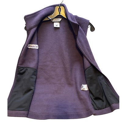 Keywords: Columbia, fleece vest, womens vest, sleeveless jacket, outdoor vest, purple vest, full zip vest, pockets, hiking vest, casual vest, layering piece, fall fashion, winter fashion, medium, M