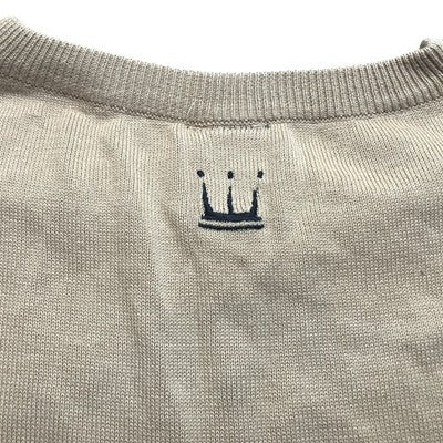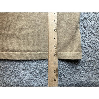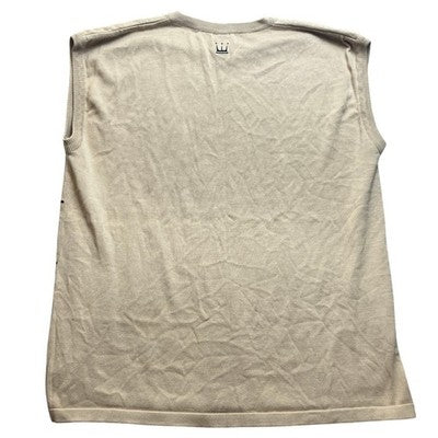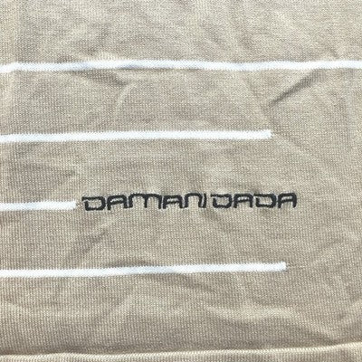 Elevate your layering game with this DAMANiDADA knit sweater vest. The versatile tan hue and subtle horizontal stripe detailing add a touch of modern flair, while the V-neckline offers a classic silhouette. Embroidered branding on the chest and near the hem provides a distinctive touch. Perfect for a polished casual look or adding a refined layer to your everyday ensemble.