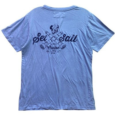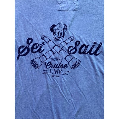 Capture the magic of a Disney Cruise with this unique graphic T-shirt! A charming tribute to nautical adventures, this periwinkle tee features two distinctive Disney Cruise Line logos: a chest print showcasing a stylized anchor and the words "Disney Cruise Line Est. 1998", and a large back print of Mickey Mouse donning a captain's hat above the words "Set Sail Disney Cruise Line Est. 1998" with crossed spyglasses. Perfect for a casual day at the parks, a themed party, or simply showing off your love for all things Disney, this shirt brings a touch of vacation fun to any outfit.