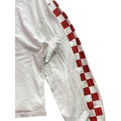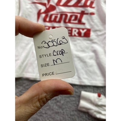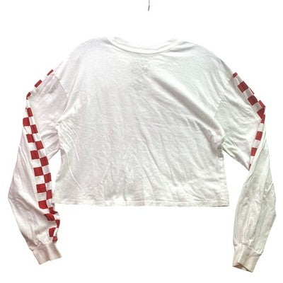 Keywords: Disney, Pixar, Toy Story, Pizza Planet, Crop Top, Long Sleeve, T-shirt, White, Red, Checkerboard, Retro, Movie, Cartoon, Medium