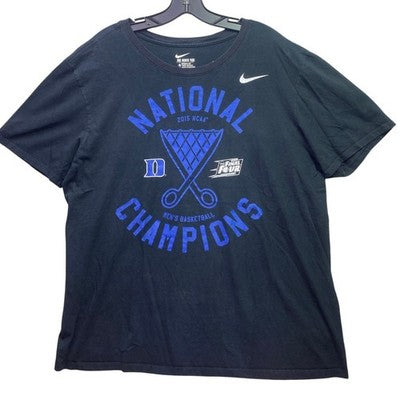 Celebrate a historic win with this iconic Nike t-shirt commemorating the Duke Blue Devils 2015 NCAA Men's Basketball National Championship! Bold blue lettering proudly declares 'NATIONAL CHAMPIONS' across the chest, accented by the Duke 'D' logo and crossed scissors symbolizing the championship tradition. The classic Nike swoosh adds a touch of athletic heritage. This shirt is perfect for reliving the thrill of victory or showcasing your unwavering team spirit. Wear it to the next game, a casual outing with friends, or while cheering on your team from home.