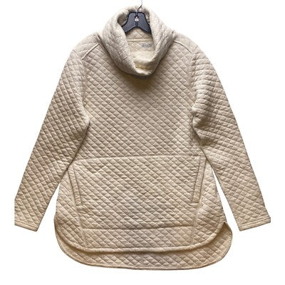 Keywords: Duluth Trading, quilted pullover, cowl neck, tunic top, beige sweater, casual top, women's clothing, long sleeve, comfortable, cozy, loungewear, relaxed fit, quilted texture