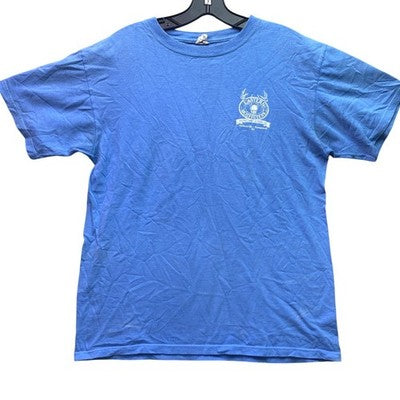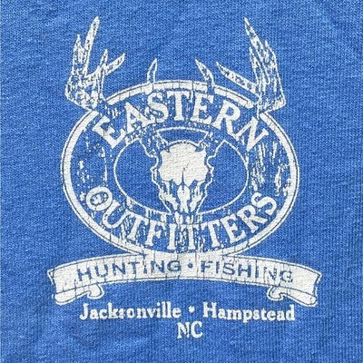 Sporting a bold graphic print, this blue t-shirt from Eastern Outfitters captures a rugged outdoor spirit. The front showcases a classic deer skull and antlers emblem, accented by the words "Hunting Fishing" and "Jacksonville Hampstead NC," evoking a connection to classic outdoor pursuits. This tee is perfect for casual wear, outdoor adventures, or showing off your love for hunting and fishing.