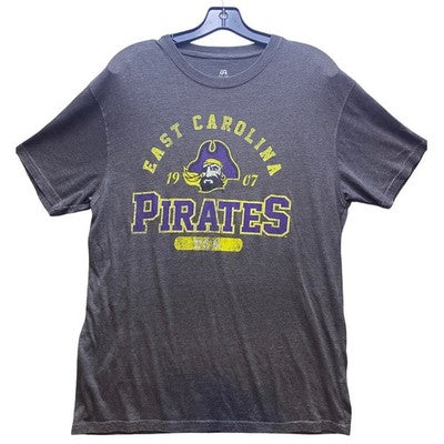 Show your team spirit with this vintage-inspired East Carolina Pirates t-shirt! The heather gray tee features a distressed graphic of the Pirates logo in purple and gold, giving it a cool, retro vibe. This comfortable and stylish shirt is perfect for game day, tailgating, or just showing off your love for the Pirates around campus. Wear it to your next college football game, a casual hangout with friends, or even while running errands around town.