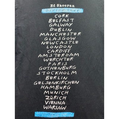 Own a piece of music history with this black Ed Sheeran Divide World Tour T-shirt. Immerse yourself in the memories of electrifying concerts with this tee showcasing a vibrant blue graphic on the front, featuring the iconic divide symbol. The back proudly lists the cities visited during the tour, creating a visual reminder of the global phenomenon. Perfect for casual outings, music festivals, or simply lounging around while expressing your admiration for a musical icon, this T-shirt is a must-have for any dedicated Ed Sheeran fan.