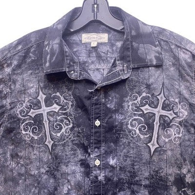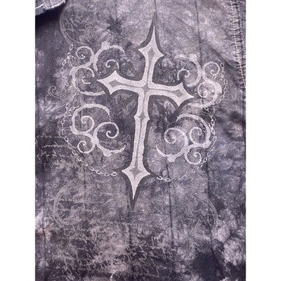 Elevate your casual wardrobe with this striking long-sleeve button-up shirt. A captivating tie-dye pattern in shades of gray creates a unique, edgy look, while the cross embellishments on the chest add a touch of gothic flair. The button-up design allows for versatile styling, wear it buttoned up for a more polished look or open over a t-shirt for a relaxed vibe. The long sleeves make it perfect for transitioning between seasons. This shirt is ideal for casual outings, concerts, or adding a bold statement to your everyday style.