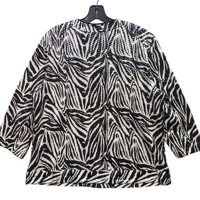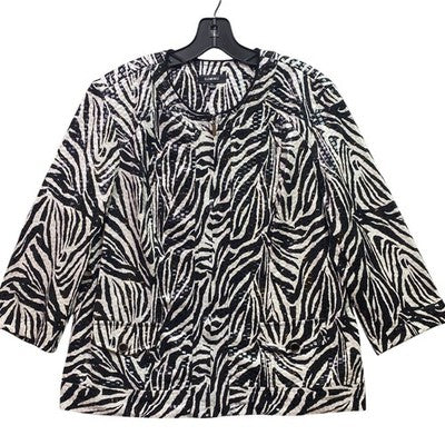 Keywords: zebra print jacket, animal print blazer, elementz jacket, 3/4 sleeve jacket, open front jacket, career jacket, casual jacket, women's jacket, xl jacket, black and white jacket, bohemian jacket, statement jacket, lightweight jacket
