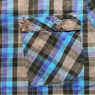 Embrace a bold look with this ENYCE plaid button-up shirt, a garment designed to make a statement. The striking pattern, a dynamic interplay of blues, blacks, grays, and hints of vibrant green, creates a visually captivating aesthetic that draws the eye. A chest pocket, adorned with two subtle bronze-toned snaps, adds a touch of utilitarian style and practical storage. This shirt is perfect for a casual weekend outing, a laid-back gathering with friends, or even as a stylish layering piece under a jacket for a night out.