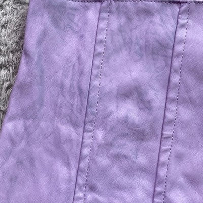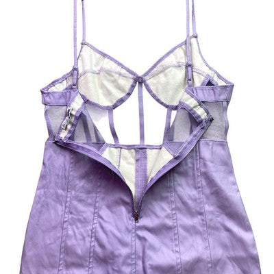 Command attention in this striking lavender mini dress, a daring statement piece that blends edgy allure with a touch of playful femininity. Imagine the smooth, supple feel of the faux leather against your skin as the intricate strappy details and sheer mesh panels create a captivating silhouette that accentuates your curves. The structured corset-inspired bodice offers a flattering lift, while the form-fitting skirt hugs your figure with confidence. This dress is your secret weapon for unforgettable nights, perfect for a club outing, a glamorous concert, or a bold bachelorette party.