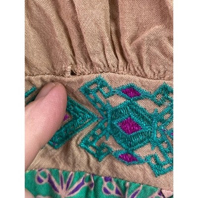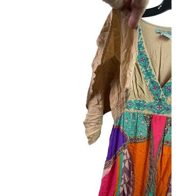 Kaleidoscope of color defines this stunning bohemian maxi dress, ready to infuse your wardrobe with effortless chic. The dress features a flowy bodice and a vibrant, patterned skirt, perfect for making a statement. Intricate embroidery around the V-neckline adds a touch of artisanal detail, while the comfortable, relaxed fit ensures all-day wearability. This unique piece is perfect for a beach vacation, a summer festival, or a casual garden party where you want to stand out with sophisticated style.