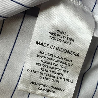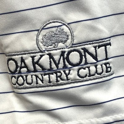 Elevate your golf game with this sharp FootJoy FJ polo shirt. Crisp white fabric is adorned with subtle blue pinstripes, offering a clean and classic look on the course. The iconic FJ logo is embroidered on the chest, and a distinguished Oakmont Country Club emblem graces the sleeve, showcasing your appreciation for quality golf apparel. Perfect for a day on the links, a casual outing with friends, or even a relaxed weekend brunch.