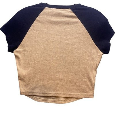 A playful twist on a classic silhouette, this Forever 21 crop top exudes casual cool with a touch of California charm. The beige body provides a soft, neutral canvas, while the contrasting black raglan sleeves add a sporty edge. A bold "California" graphic, complete with a bear emblem, is emblazoned across the chest, offering a nod to West Coast vibes. The cropped length makes it perfect for pairing with high-waisted jeans or skirts, creating a flattering and on-trend look. This top is ideal for weekend outings, casual hangouts with friends, or adding a touch of laid-back style to your everyday wardrobe.