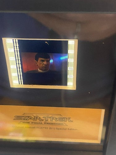 This Genuine Film Cell USFC2792 features a iconic scene from Star Trek The Final Frontier (S1). The cell is matted and framed, making it a perfect addition to any collection. It can be personalized and mounted, and is a great piece of movie memorabilia for any entertainment enthusiast. The cell is a must-have for Star Trek fans and collectors alike.