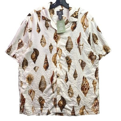 Keywords: H&M shirt, men's short sleeve shirt, seashell print shirt, viscose shirt, LivaEco Viscose, regular fit shirt, summer shirt, beach shirt, casual shirt, tropical print shirt, men's fashion, new with tags, conscious choice, coastal style