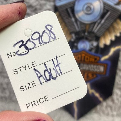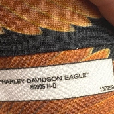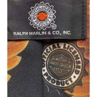 Unleash your inner rebel with this striking Harley Davidson tie, boldly designed for the motorcycle enthusiast. Dominating the center is a magnificent eagle in flight, its wings outstretched against a backdrop of dramatic lightning bolts, symbolizing freedom and power. Beneath the eagle, the iconic Harley Davidson Motor Cycles logo is proudly displayed, showcasing your allegiance to the legendary brand. Crafted by Ralph Marlin, this tie is more than an accessory; it's a statement piece that exudes rugged individuality and a passion for the open road. Perfect for casual gatherings, motorcycle rallies, or adding a touch of edge to your everyday look.