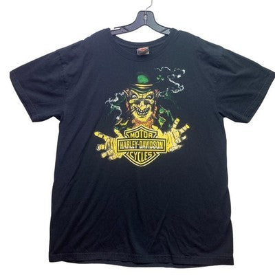Keywords: Harley Davidson, Cycles, Leprechaun, Graphic Tee, Mens T Shirt, Black Shirt, Motorcycle Apparel, Streetwear, Casual Wear, Unique Design, Statement Shirt, Irish Theme