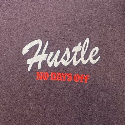 Keywords: graphic tee, t-shirt, mens, streetwear, hustle, no days off, skeleton, graphic print, casual, brown, crew neck, unique design