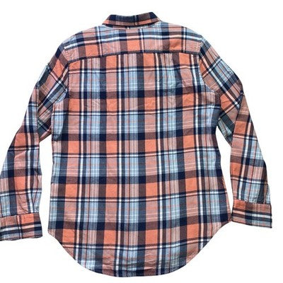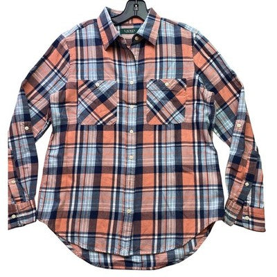 Effortlessly layer this classic Lauren Ralph Lauren plaid flannel shirt for a comfortable yet stylish look. The rich palette of coral navy and light blue creates a visually appealing pattern across the soft fabric. Two chest pockets add a functional touch while the button-down front allows for versatile styling. Perfectly suited for casual outings weekend adventures or layering up on cooler days.