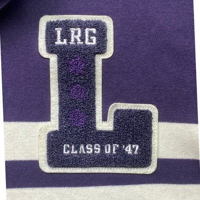 Discover a vibrant LRG polo shirt that brings bold style to your wardrobe. This eye-catching piece features crisp horizontal stripes across the chest and a distinctive embroidered 'L' graphic with 'CLASS OF 47' detailing, showcasing classic athletic-inspired design. The rich purple hue and comfortable knit make it a versatile addition for casual outings or relaxed weekends.