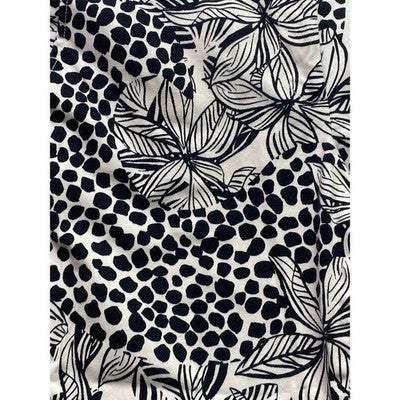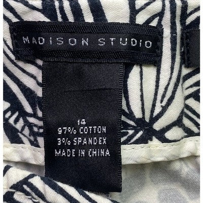 These Madison Studio cropped capri pants showcase a captivating black and white leaf print, offering a chic and versatile addition to your wardrobe. Designed with the Alexandra Fit for a flattering silhouette, these pants transition effortlessly from a casual day out to a sophisticated evening gathering. The playful yet elegant print ensures you'll stand out with effortless style. Perfect for brunch with friends or a relaxed vacation stroll.