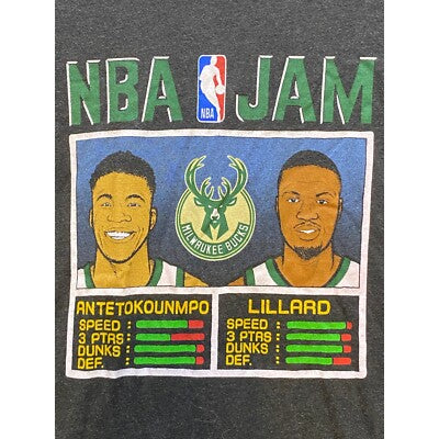 Keywords: Homage, NBA Jam, Milwaukee Bucks, Antetokounmpo, Lillard, Graphic Tee, T-Shirt, Menswear, Basketball, Retro Gaming, Vintage, Streetwear, Casual, NBA