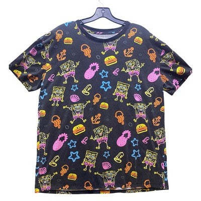 Nickelodeon Shirt Mens Extra Large Spongebob Neon Trippy Hip Hop Black AOP