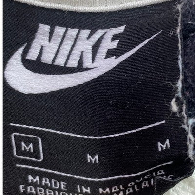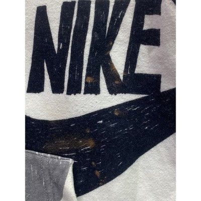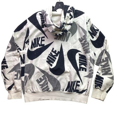 Keywords: Nike hoodie, Nike sweatshirt, all over print, logo print, graphic hoodie, pullover hoodie, men's hoodie, casual hoodie, sportswear, streetwear, athleisure, Nike logo, Nike swoosh, size M, white black gray