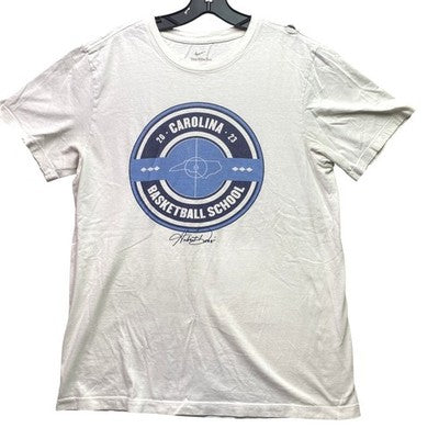Show your support for the Carolina Basketball School with this classic Nike graphic tee. This comfortable shirt features a bold circular design with 'Carolina Basketball School' and the year '20-23' prominently displayed. The iconic North Carolina state outline is subtly incorporated into the basketball court graphic, making it a perfect piece for any fan. The Nike logo at the neckline assures quality and athletic style. Ideal for game days, casual outings, or representing your favorite team.