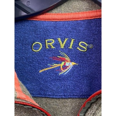 Embrace effortless style with this Orvis pullover, a harmonious blend of comfort and casual sophistication. This sweatshirt features a quarter-zip design, adding a touch of versatility to your wardrobe, while the soft fabric offers a cozy feel against the skin. The subtle olive green hue complements any outfit, making it a staple for laid-back days or outdoor adventures. A distinctive embroidered logo on the interior adds a touch of subtle branding and visual interest, elevating the overall design. Perfect for weekend getaways, casual Fridays, or relaxing evenings by the fire.