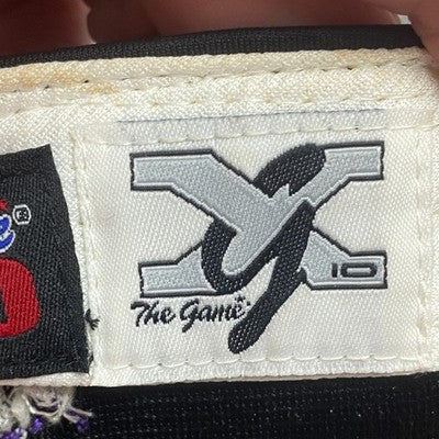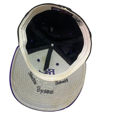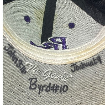 Step up to the plate with this game-worn baseball cap that tells a story of grit and passion! The striking gray crown meets a vibrant purple brim, a bold color contrast that grabs attention. The cap is adorned with detailed embroidery showcasing the PBC logo on the front and a baseball-themed emblem on the side, while the back proudly displays another PBC design, ensuring team spirit from every angle. Inside the brim, players' names and numbers are etched, adding a personalized touch and hinting at the cap's exciting journey on the field. Imagine sporting this unique piece at a baseball game, a casual hangout with friends, or even as a standout accessory at a sports-themed event.