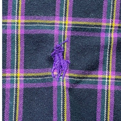 Elevate your casual wardrobe with this classic Ralph Lauren Blake button-down shirt. Experience the comfort of 100% two-ply cotton in a timeless plaid pattern featuring deep black, vibrant purple, and striking yellow accents. A subtle embroidered purple pony logo adorns the chest, adding a touch of signature style. Perfect for a relaxed weekend outing, a casual office day, or layering for a stylish evening look.