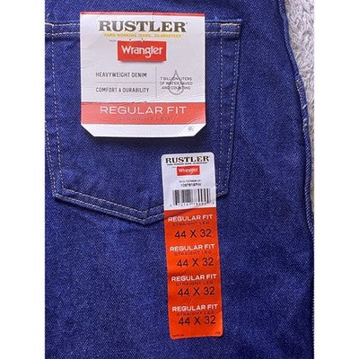 Keywords: Rustler jeans, Wrangler jeans, Mens jeans, Heavyweight denim, Regular fit jeans, Straight leg jeans, 44x32 jeans, Blue jeans, Work jeans, Casual jeans, New with tags jeans, Durable jeans, Comfortable jeans
