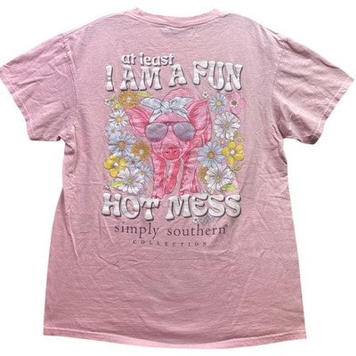 A playful pink tee radiates summertime fun. The shirt features a whimsical graphic on the back depicting a pig wearing sunglasses and a bandana amidst colorful daisies, accompanied by the phrase 'at least I am a fun hot mess' in a stylized font. This playful top captures a carefree spirit and makes a statement wherever you go. Perfect for casual outings, weekend adventures, or adding a touch of humor to your everyday wardrobe.